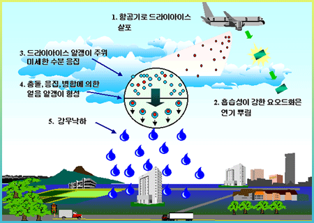 서로 엉겨붙을 거리만 찾고 있다가 누군가가 가져온 장난감에 달라붙 듯 한번 엉기기 시작한 눈송이는 주위의 수분을 뭉치면서 점점 크기가 켜져서 드디어는 함박눈 형태로 내리기 시작한다. 이런 원리, 즉 빙핵이 있어야 눈이 형성되기 시작하는 것은 비가 오는 경우에도 성립한다. 구름이 가득한 상공에 요드화은을 뿌리게 되면 요드화은은 상공에서 얼음 알갱이를 형성하면서 주위의 수분을 모은다. 고도가 낮아지면서 공기의 기온은 높아지고, 높아지는 온도 때문에 떨어지는 얼음알갱이는 물방물로 변하여 비가 되어 내린다. 요드화은은 상공에서 뿌리기도 하지만 지상에서 요드화은으로 연기를 만들면 상공으로 타고 올라가기도 한다. (그림 5)