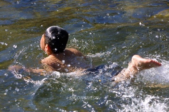 (사진; 개헤엄. 시골 냇가에서 볼 수 있는 가장 자연스러운 수영법이다)