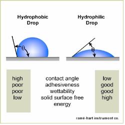 물방물이 접촉하는 표면과 이루는 각도, 즉 접촉각은 표면의 성질, 예를 들면 얼만큼 물과 친하냐 (친수성), 친하지 않고 배척하느냐 (소수성)에 따라 변한다. 표면이 소수성이 강할수록 물방물은 점점 동그란 형태로 있고 물방울이 퍼진 형태가 된다는 이야기는 물분자와 표면이 서로 당기는 힘이 있고 이런 친수성 표면에 물이 젖게된다. 따라서 이런 표면 접촉각을 측정하게 되면 표면의 소수성 정도를 측정 할 수 있게 된다.