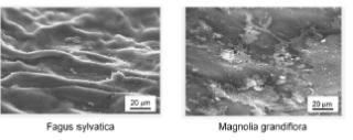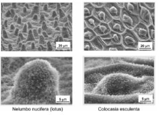 따라서 물방울이 잎 표면을 적시지 않고 반발하듯이 둥굴둥글 돌아다니게 된다. 이런 잎에는 연꽃잎 그리고 토란 잎등이 있다. 물에서 넓은 잎을 가지고 있는 식물은 잎에 양초와 같은 왁스성분을 3차원적으로, 즉 울퉁불퉁한 것이 특징이다. 그래야만 물위에 떠 있을 것이다. 만약 물에 젖는 구조라면 아마도 물속으로 가라않게 될 것 이다. 물론 다른 식물의 잎은 이와는 달리 친수성인 잎들도 있다. 이 들 잎은 울퉁불퉁한 3차구조가 아니고 거의 편편한 2차원적 구조를 가진다. 또한 잎의 성분들도 조금 다르다. 너도밤나무나 목련등은 나무로서 수분이 필요할 것이고 잎에 떨어지는 빗방울이나 이슬 등을 마다할 이유가 없을 것이다. 하지만 이는 좀 더 깊은 연구가 필요한 부분이다.