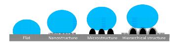 이 중에서 접촉각이 150도 이상되는, 따라서 물방물이 거의 표면에 떠 있다시피한 상태를 극소수성(super-hydrophobicity)이라고 부르고 연꽃잎이 이에 해당된다. 물방울이 어떤 표면에 접촉 할 때 표면의 구조가 중요하다. 완전히 편편한 경우보다는 울퉁불퉁한 표면이 물과의 접촉면이 적어지고 따라서 물방물을 접착시키는 물방울들이 둘 사이에 적게 있게 된다. 적게 존재하는 물방울분자는 그만큼 접착력을 적게 한다.