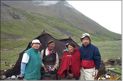 그들이 손에 염주처럼 생긴 것을 빙글빙글 돌리는 것을 보면 티벳이 불교국가이고 민족의 대부분이 불교신자라는 것이 이해된다. 중국말이 안 통하는 티벳고유 말로 무어라 한다. 겨우 손짓발짓으로 사진을 찍자고 했는 데 의외로 쉽게 승낙한다. 소녀는 여전히 천막 속에서 얼굴만을 내밀고 있다. 사진을 찍고 돌아서는 일행을 붙잡는 것은 40쯤 되어보이는, 아니 얼굴의 주름을 헤치고 보면 어쩌면 20초반 일 것 같은 여인이었다. 손가락을 비비는 형태로 보아 돈을 달라는 것 같다. 영화에서 자주 등장하는 이 제스쳐를 이 여인이 쓰는 것으로 보아 본능적이거나 만국 공통의 제스쳐인지도 모른다는 생각이 퍼뜩 든다. 어이가 없기도 하고 나같은 관광객이 너무 많이 이 여인을 문명화시켰구나 하는 씁쓸함에도 불구하고 적지 않은 돈을 주었다. 하지만 받는 여인의 표정이 별로 반가워하지도 않는다. 고약함에 다시 돌아서는 데 계속 손가락으로 얼굴을 비비는 모양을 하며 우리를 붙잡는다. 같이 간 그 지역 교수의 도움을 받아서 겨우 알아들은 소리는 놀라웠다.
