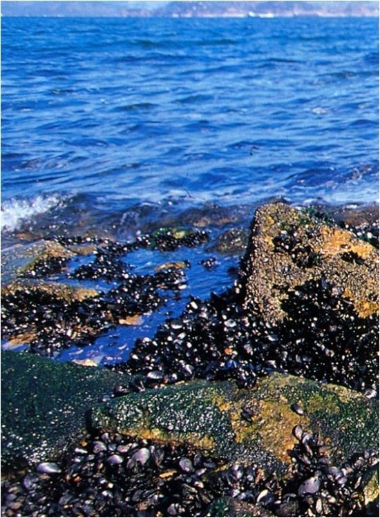 홍합을 좋아하는 이유는 비단 포장마차의 낭만 때문만이 아니다. 홍합하면 떠오르는 곳은 해변 바위와 푸른 바닷물이다. (사진; 바다에 붙어있는 홍합). 낭만과 접해 있는 곳이다. 파도가 출렁이고 바위가 있는 곳에서 일몰이라도 볼 수 있다면 더 할 수 없는 행운아다.
