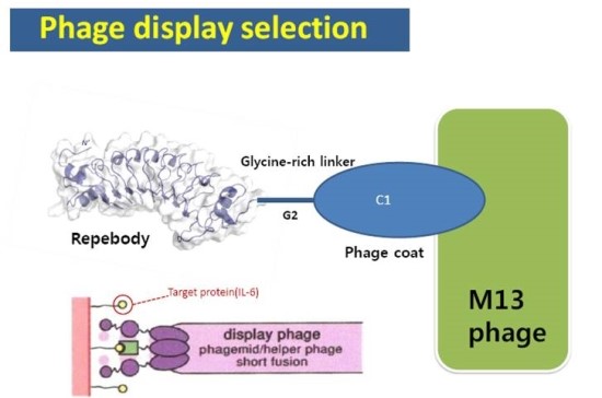 인간의 면역계는 이미 준비되어 있는, 즉 어떤 것이 내 물질인가 라는 데이터를 태아 초기에 어미의 데이터를 그대로 가져온다고 알려지고 있다. 이렇게 초기에 태아의 면역이 확립된다. 그러면 어미 때에는 없는, 그래서 물려받은 면역데이터에는 없는 신종 바이러스가 들어오면 어떻게 이에 맞는 항원을 만드나? 알려진 바로는 신종 바이러스에 가장 가깝게 달라붙는 B 세포가 앞장선다는 것이다. 즉 100% 맞는 B 세포가 없어도 80% 맞는 B 세포가 신종 바이러스에 맞는 세포로 활동하기 시작하면서 점차 100%에 맞게 변화하여 다음에 신종 바이러스가 들어오면 이미 준비된 B 세포들이 활동을 시작한다는 학설이다. 이를 모방해서 박테리오파지의 외벽에 여러 종류의 Fab를 인공적으로 만들고 이중에서 신종 바이러스에 가장 근접한 Fab를 고르는 방법인 'phage display" 방법은 정확한 생체 모방기술이다. 연구자들은 인체의 무한한 능력에 그저 놀랄 뿐이다. 우리는 인체의 숨겨진 기술을 찾아내기도 바쁘다. 최근에는 다양한 구조의 Fab를 마음대로 수천가지를 쉽게 만드는 방법으로 항체란 개념을 떠나서 찾고 있다. 인체와 유사한 구조의 단백질의 가지는 동물 중에서 장난감 레고의 블록물질을 찾는 것이다. 하나의 레고 블럭 이지만 수백 개를 조합하면 무언가에도 붙을 수 있는 Fab를 만들 수 있기 때문이다 (그림; 단백질 스카폴드)