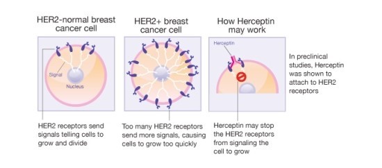 유방암 환자의 경우 1/3에 해당하는 환자에게서 많이 발현되어 있는 안테나 수용체가 있다. HER-2/neu (Human growth factor 2)유전자는 정상인의 경우 2개씩 가지고 있으나 암세포의 경우 2개 이상이 발견되고 또한 이로 인해 생산된 수용체가 정상세포에 비해 무려 100배나 많이 생산된다. HER2 유전자에 의해 생산되는 이 단백질은 세포의 성장을 촉진하는 역할을 하고 있으며 따라서 이 수용체의 역할을 억제하거나 이런 수용체가 과발현되어 있는 세포를 공격한다면 암세포만을 선택적으로 공격할 수 있게 된다.