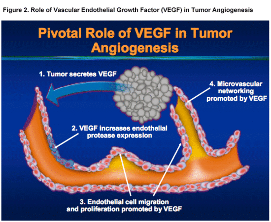 혈관내피성장인자인 VEGF(Vascular endothelial growth factor)는 혈관을 형성하는데 필요한 단백질이다. 처음 태어나서 인체 내의 혈관이 형성 될 때 왕성하게 활동한다. 또한 새로운 혈관형성이 필요할 때, 예를 들면 상처가 난 곳에 혈관을 다시 만들어야 할 때나 혈관이 막혀서 다시 만들어야 할 때 등에 필요한 물질이다. 이것이 절실히 필요한 놈이 있다. 다름아닌 덩어리 형태의 고형 암이다. 암이 성장함에 따라 영양분이 필요하고 이는 혈관에 의해서 공급된다. 따라서 덩어리의 고형 암은 암세포가 VEGF를 생산하여 암세포 주위에 혈관을 만들어 커 나가고 더불어 다른 곳으로 이동하려한다. 스스로 알아서 보급목적으로 고속도로를 만들어나가는 능력은, 죽여야 할 암세포이지만, 참으로 배울 만하다.(그림; 혈관을 생성하여 자라나는 암세포)