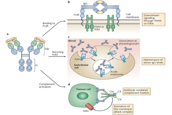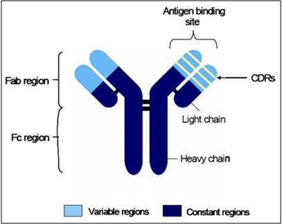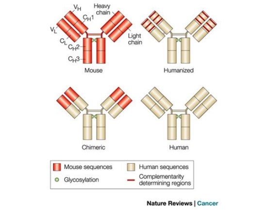 최종목표는 인간의 항체와 유사한 항체를 만드는 것이다. 항체는 정교한 구조를 가지고 있다. 적을 확인해서 달라붙는 머리 부분(Fab)과 달라붙은 후 해당 세포를 공격하는 목적의 꼬리 부분(Fc), 두 부분으로 구성되어 있다 (그림; 항체의 구성). 머리(Fab) 부분은 달라붙는 표지분자의 구조에 따라 여러 종류의 구조를 가지는 가장 변화가 심한 부분이다. 여기를 잘 만들어야 한다. 미사일의 유도 안테나 역할을 하기 때문이다. 그에 비해 꼬리의 Fc 부분은 비교적 일정하다. 미사일에서 몸체에 해당하는 부분이다. 따라서 이곳은 인간의 Fc 유전자로 대체하기가 비교적 쉽다. Fab는 쥐의 것, Fc는 인간의 것인 항체, 소위 ‘humanized' 된 항체는 인간면역계에서 좀 더 인간 것으로 취급하여 공격을 덜 당한다.