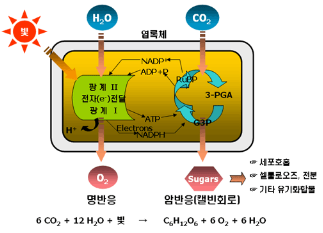 광합성은 두 단계의 반응, 명반응과 암반응으로 되어있다. 밝다는 의미의 명반응은 빛이 관여하는 반응이다. 즉 빛의 에너지를 잡아서, 다음 반응에 쓸수 있는 화학에너지(NADPH)롤 만드는 것이 명반응이다. 반면에 암반응은 빛이 관여하지 않는다. 이 반응은 빛에서 만들어낸 에너지, 즉 앞의 명반응 결과인 NADPH 같은 고 에너지물질을 소모하면서 이산화탄소를 포도당으로 만든다. (사진; 광합성의 두단계).