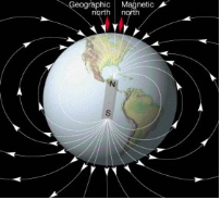 (그림; 지구의 자장; 북그과 남극을 중심으로 각도, 위치, 세기가 변하여 위치 정보를 줄 수있다)