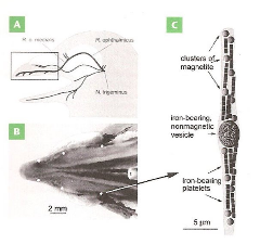 현재까지 밝혀진 동물들, 특히 철새들을 중심으로 알려진 내비게이션 기술은 두 가지이다. 하나는 자성박테리아에서 보듯 생체내에 미세한 자성입자를 가진 경우이다. 지구 자기장같은 미세한 자장에서도 자성을 띠려면 아주 작은 철 입자이어야 하는데 자성박테리아의 경우, 50 nm(nm; 백만분의일 미터) 이하의 크기로 쉽게 자성을 띠어서 생체내의 나침반 역할을 한다. 비들기의 부리 주위에서 발견되는 자성입자는 이런 현상을 뒷밭침한다. 신경세포주위에 형성된 자성입자들은 지구의 위치에 따라 계속 신호를 신경세포로, 뇌로 보내주고 있따. (그림 참조 )