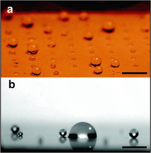 연꽃잎위의 물방울이 동그랗게 있는 것은 연꽃잎이 지극한 소수성이기 때문이다. 나무판위 물방울을 놓으면 좀 더 납작하게된다. 물방울과 바닥이 만나는 각도, 소위 접촉각을 측정하면 바닥의 친수성, 소수성여부를 측정할 수 있게 된다. MIT 연구팀들은 소수성을 최대한 올리기위해서 여러 물질을 테스트하였다. 그 중 소수성이 높은 재료들을 이번에는 층층이 쌓는 방법을 시도하였다. 시도는 성공이었다. 초소수성 물질위에 물방울은 거의 원형에 가까웠다. 거의 곧추서다시피 한 것이다. 접촉각이 170도를 넘어섰다. 바닥을 초소수성으로 만든 후에 거기에 친수성 돌기를 만드는 일은 좀 쉬웠다. 바닥에 점 형태로 떨어뜨리면 되었다. 이렇게 만든 판위에 안개를 피면 물방울이 형성되는 것이 관측되었다 (사진)