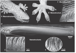 게코도마뱀의 발바닥은 길이 50∼100마이크로미터(μm; 1마이크로미터는 백만분의 1 미터), 지름 5∼10μm인 수백만 개의 강모로 덮여 있고 다시 하나의 강모는 수백 개에 달하는 주걱 모양의 섬모(길이 1∼2μm, 지름 200∼500나노미터)로 갈라진다. 이들 섬모의 개별적인 접착력인 반데르바알스 힘은 약하지만 수억 개가 합쳐지면 도마뱀 무게의 수십배까지도 벽면에 붙일 수 있는 힘이 된다. 머리카락 하나하나는 약하지만 수만개가 모여지면 잡아당겨도 튼튼한 정도의 밧줄같은 힘이 나온다고 할 수 있다.