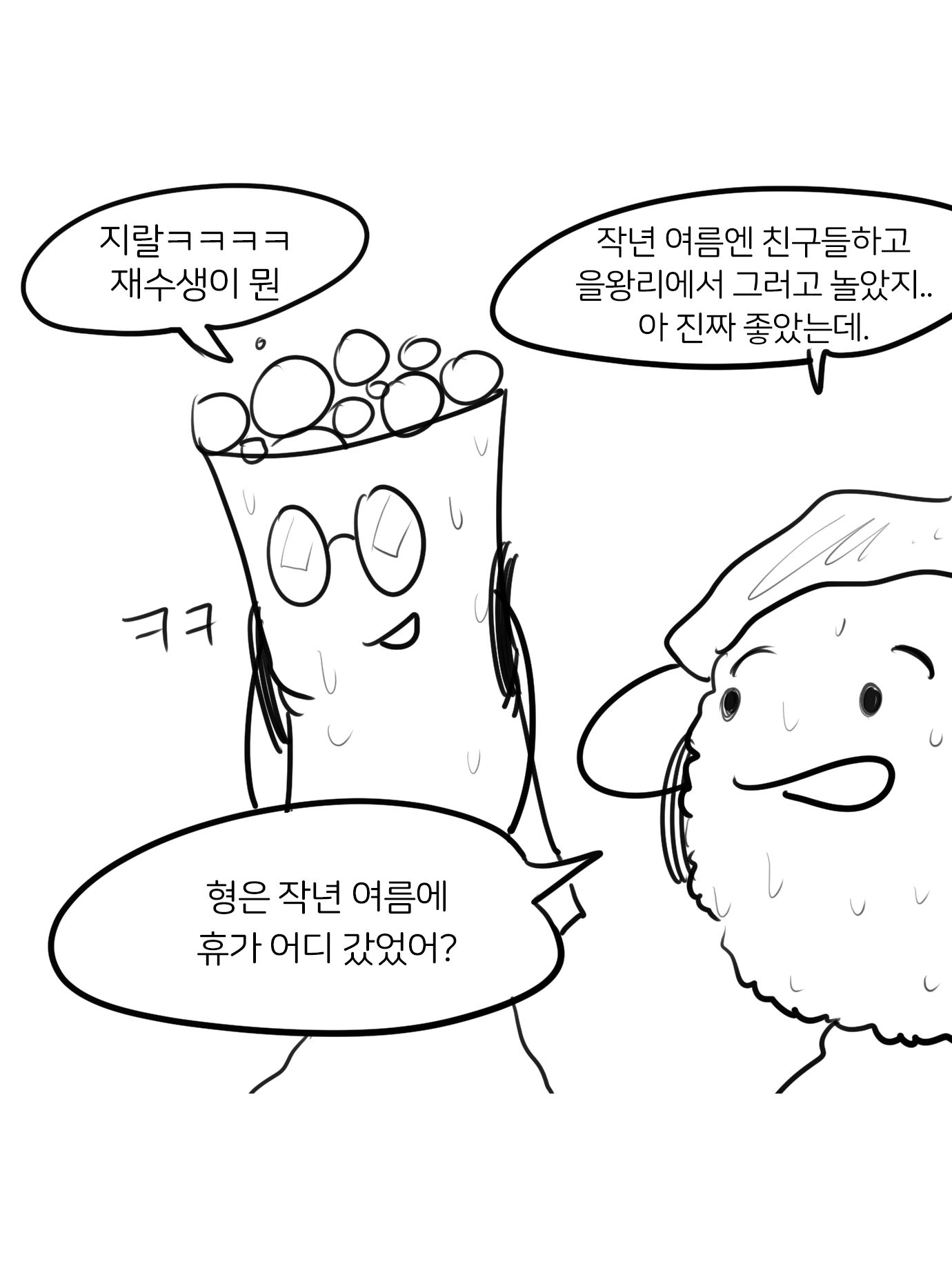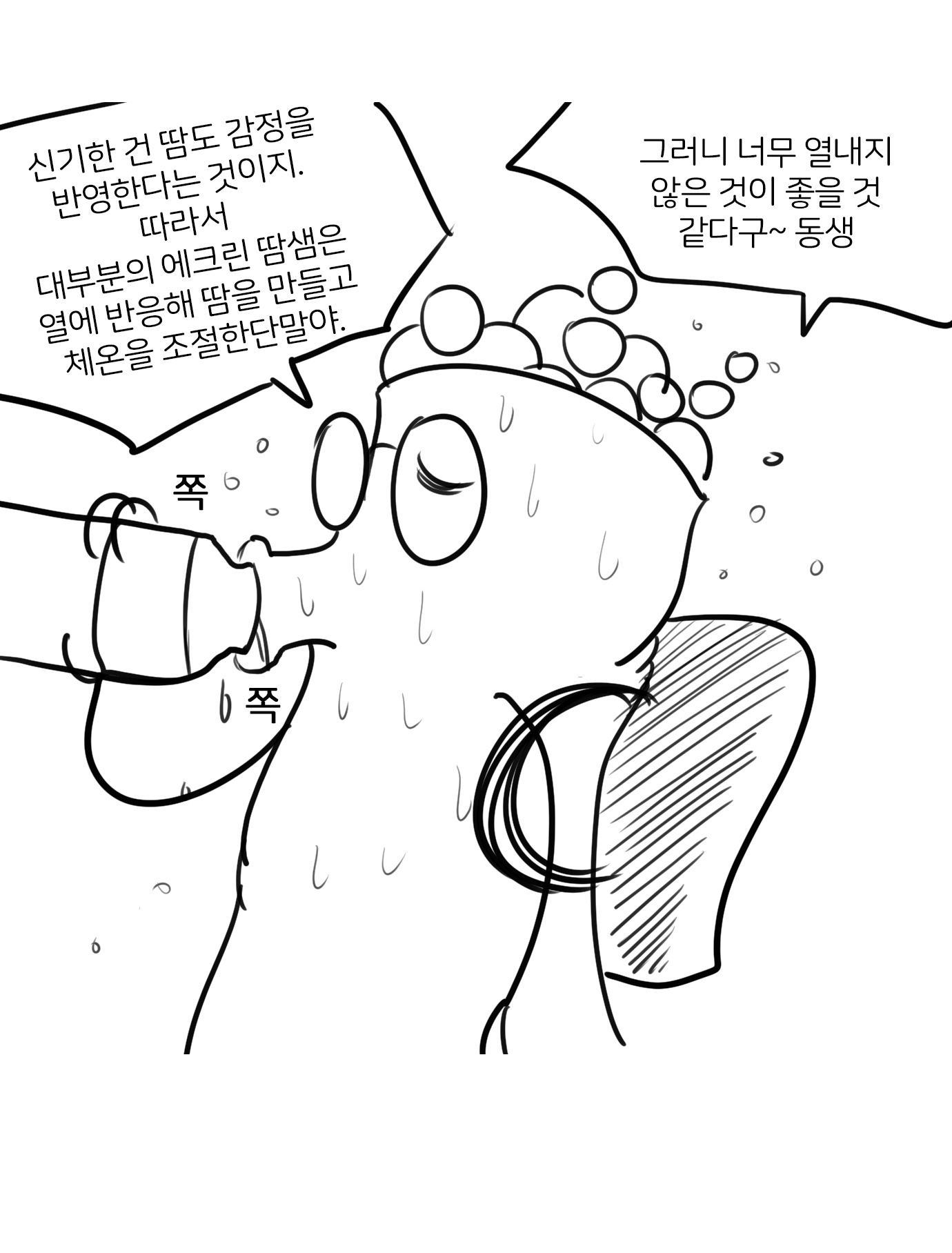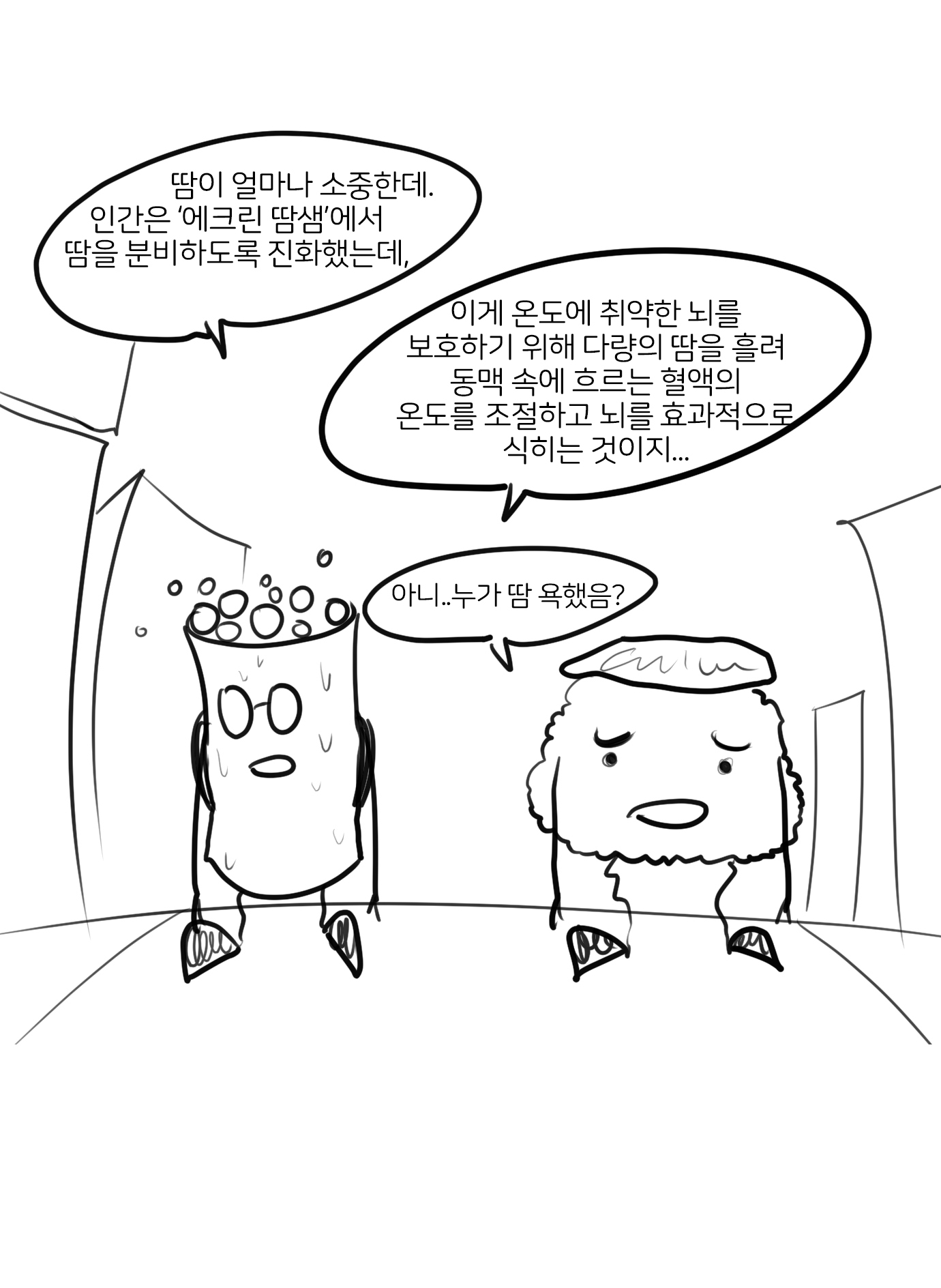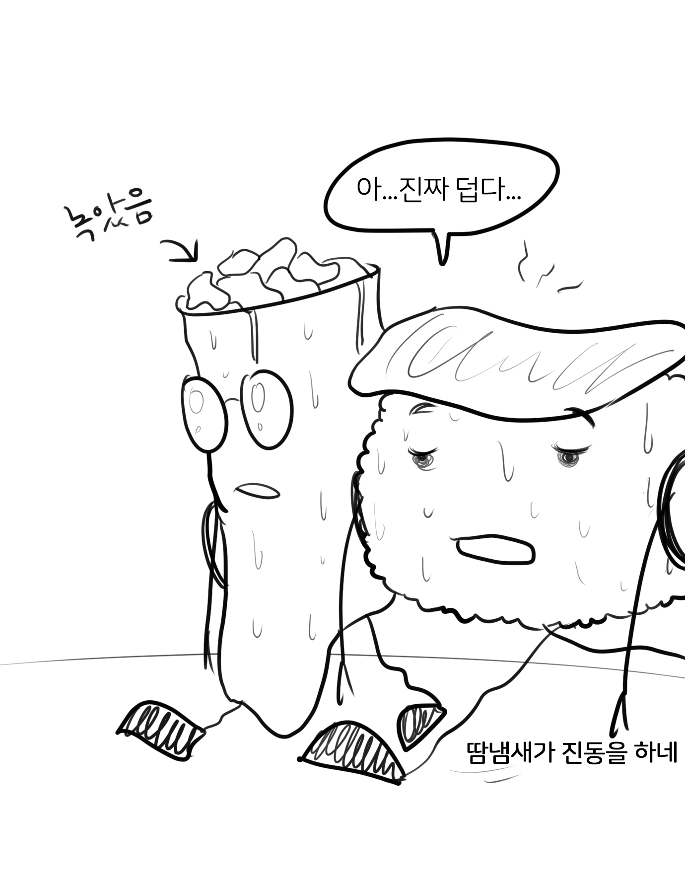 16화 휴가 가고 싶은 만화 (*땀) 사람이나 동물의 땀샘에서 분비되는 대부분이 물로 된 액체이다. 체온 조절의 역할을 한다.