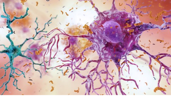뇌세포(청색, 자색) 사이사이 노폐물(황색·아밀로이드, 타우)이 청소되지 못하고 만성염증을 일으켜 뇌세포를 죽인다.
