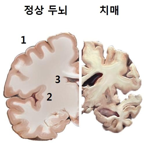 치매 환자. 정상(왼쪽) 에 비해 뇌세포가 죽어 위축됐다. 종합사고담당 대뇌피질①, 단기기억 해마②)가 졸아들었고 뇌 사이 공간③이 넓어졌다.