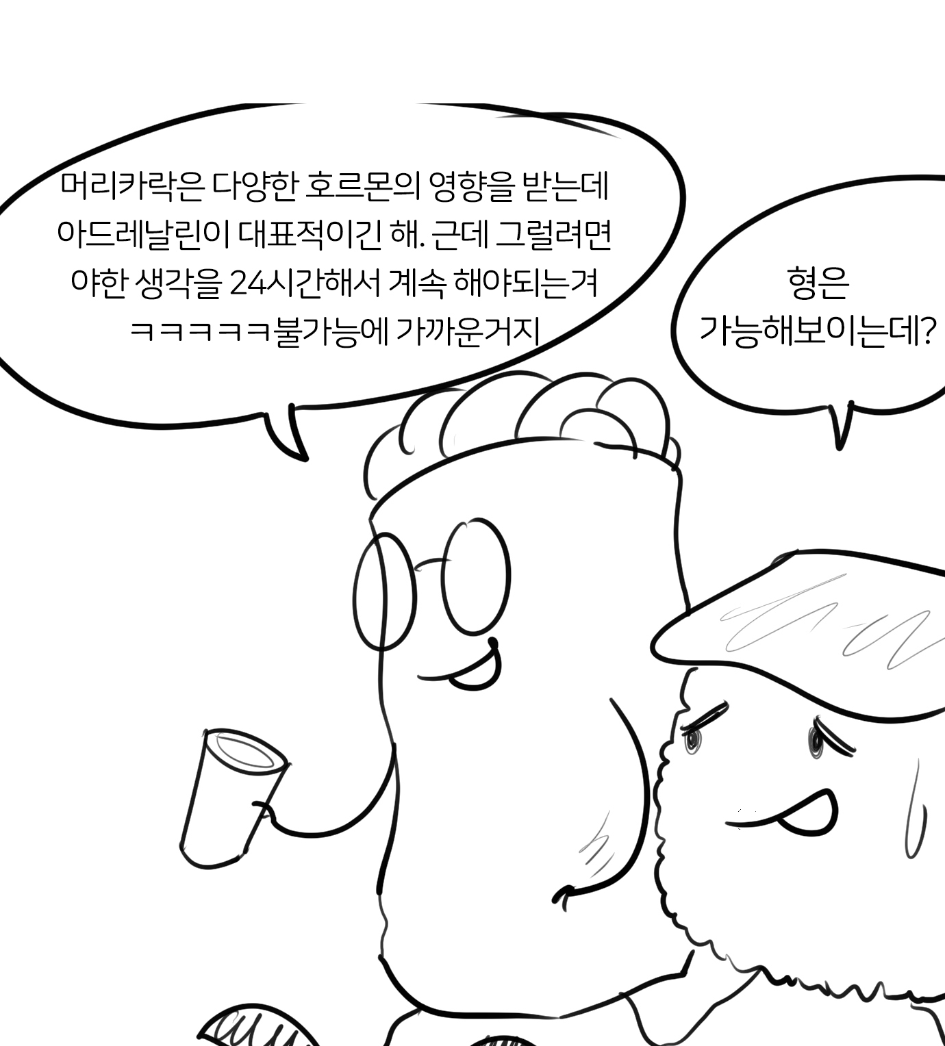 지 않고 가늘어지는 퇴행기를 거쳐 휴지기로 들어갑니다. 오래된 머리카락은 모낭에서 떨어져 빠지고 새로운 머리카락의 성장