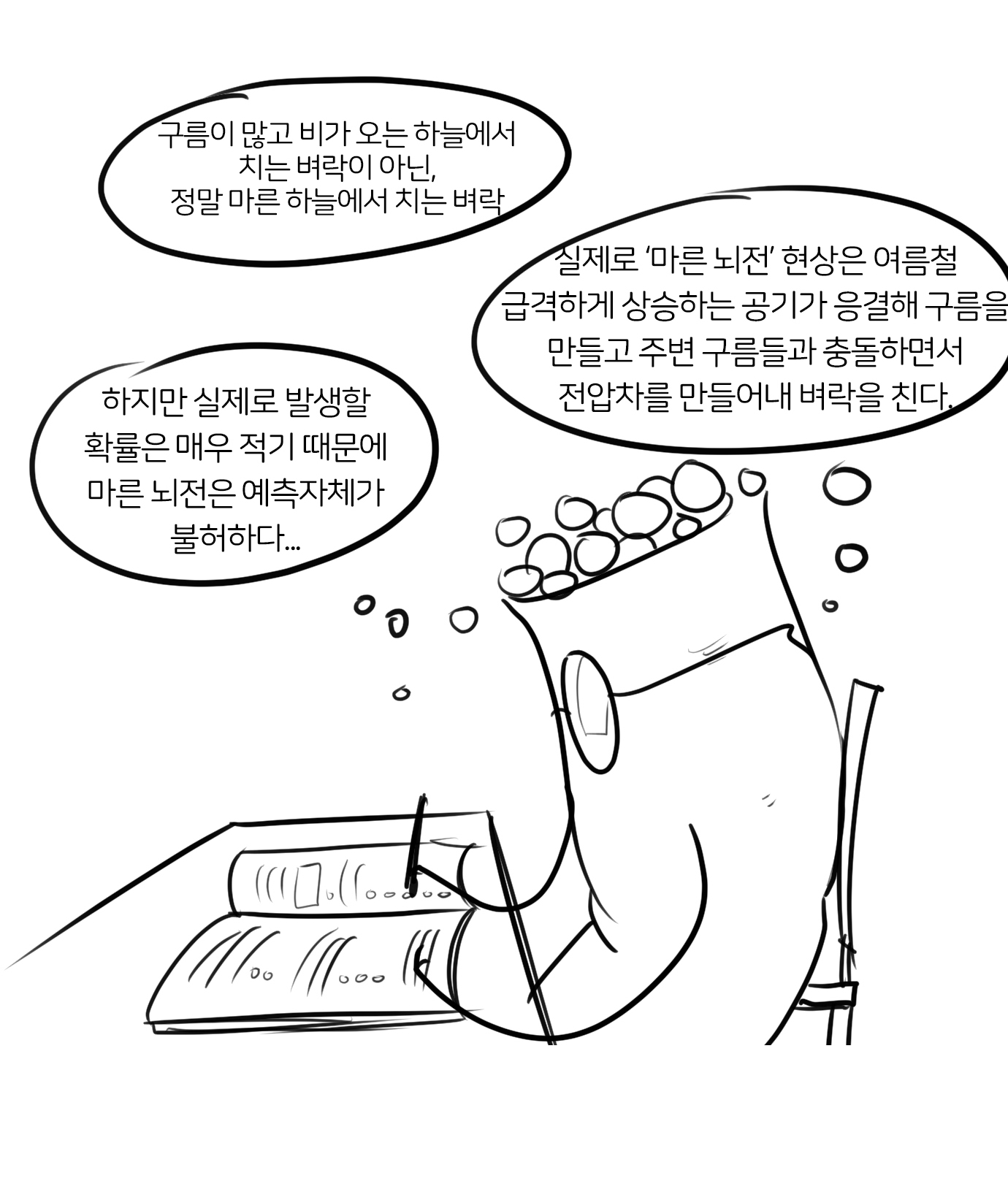 19화 마른 뇌전 벼락의 속도는 빛의 10분의 1 정도로 빠르고 전류는 3만 암페어(A), 전압은 무려 1억 볼트(V)에 달한다. 벼락이 지나간 주변의