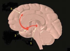 뇌의 중독 회로. 복측피개영역(1)-중격측좌핵(2)을 연결하는 쾌락회로엔 도파민이 흐르고 전전두엽(3)과 연결돼 있다.