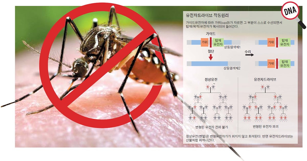 유전자드라이브는 암수가 짝짓기하는 경우만 적용된다. 스스로 분열하는 박테리아·바이러스는 대상이 아니다. 빠른 속도로 번식하는 모기·쥐 등이 대상이다. 지구 전체 모기는 3500종이다. 그중 말라리아모기, 지카·뎅기열·황열모기 2종이 목표다. 1800종 쥐 중 뉴질랜드 외래침입 9종이 대상이다. 비록 없애려는 종이 적다 해도 이런 가공할 기술을 야생에 적용하는 데 문제가 없을까.
