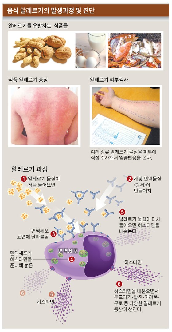 인체 알레르기 90%는 먹는 음식에서 온다. 달걀·우유·밀·콩·땅콩·호두·밤·생선·조개 등이다. 소아 알레르기 50%는 크면서 없어지기도 한다. 하지만 성인 4%는 계속되는 알레르기로 평생 고생한다.