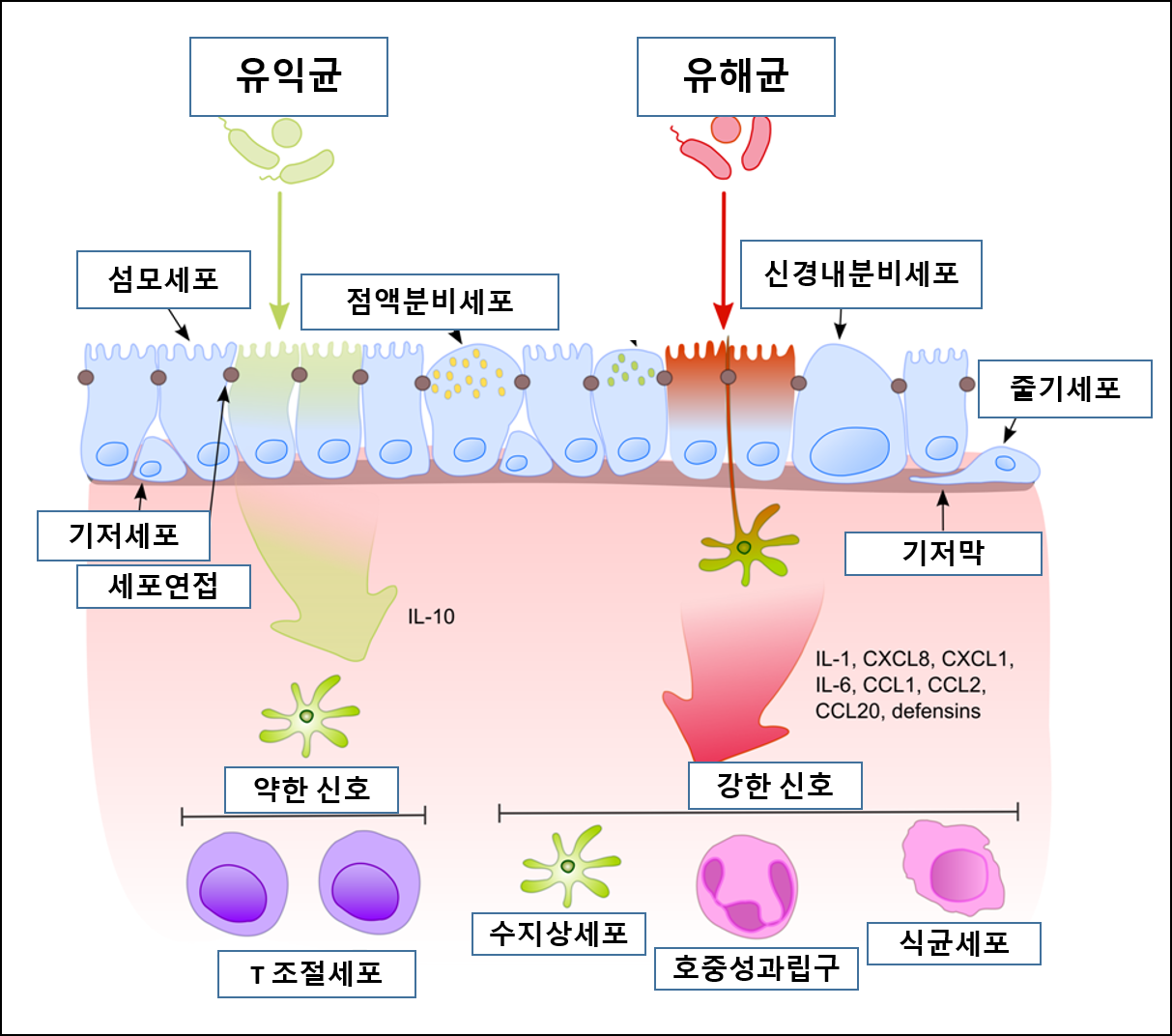 축농증 유해균은 황색포도상구균(Staphylococcus aureus)과 해모필루스 인플루엔자(Haemophilus influenzae)균이 대표적이다. 건강한 사람의 콧속에서는 이놈들이 유익균(락토바실러스)에 기를 못 펴고 찌그러져 있다. 연구진은 실험실에서 이들끼리 싸움을 붙였고, 결과는 명확했다. 유익균은 유해균 성장을 방해했다. 유익균이 우세하면 콧속 세포들은 염증반응이 없는 건강한 상태를 유지하고, 유해균이 우세하면 콧속 세포들이 비상 신호(인터루킨)를 울리고 이 비상 신호에 따라 면역이 출동한다. 다른 곳에 있던 공격용 면역세포(마크로파지, 수지상세포 등)들이 득달같이 달려든다. 몰려온 면역세포들과 유해균간의 전투로 부비동은 아수라장이 되고 혈관이 커져서 붉게 부어오른다. 급성부비동염이 생긴 거다. 유익균과 유해균의 우위에 따라 염증발생여부가 결정된다. 유해균 중에는 바이러스도 있다. 10일 정도 전투가 벌어지는데, 바이러스성이면 10일 이내 가라앉고, 세균성이면 10일이 지나도 지속할 수 있다. 결국 콧속 염증은 유해 바이러스나 세균이 우세해서 생긴다. 이걸 억누르는 유익균이 있다면 설사 유해균이 들어와도 면역-염증반응이 안 생긴다.