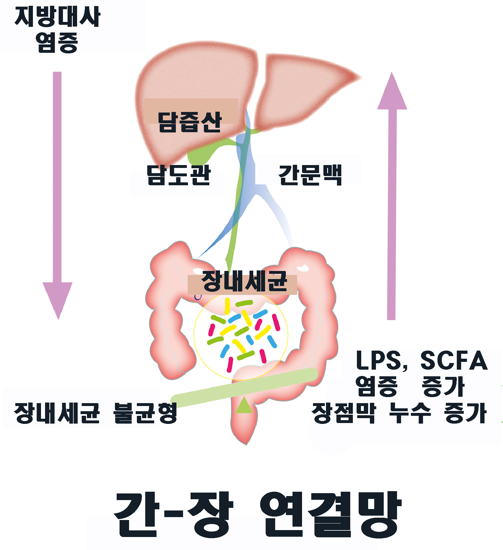 ‘애간장을 태운다’는 말이 있다. ‘애’와 ‘장(腸)’은 모두 창자를 뜻한다. 몹시 안타까운 스트레스가 간과 창자로 동시에 간다는 말이다. 맞다, 둘은 연결되어 있다. 간아래 부분에 담낭이 붙어있다. 간에서 만들어진 담즙(쓸개즙)이 여기에 저장되었다가 담도관을 통해 십이지장으로 내려간다. 담즙은 장내세균이 지방대사에 직접 영향을 미친다. 간--장 연결라인의 한 축이다. 또 한 축은 간문맥(肝門脈) 혈관이다. 간에 가는 혈액의 75%가 이리로 온다. 소화기관(장,위)에서 만들어진 대사물질이 간문맥을 따라 간으로 간다. 두 개의 고속도로가 간-대장사이에 있는 셈이다.