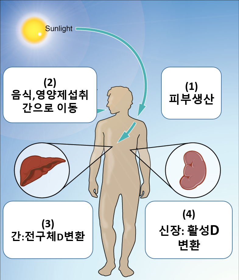 그림3: 비타민D 활성화단계:(1)햇볕을 받으면 피부에서 생성 (2)음식, 영양제로 섭취(3)비타민D는 간에서 혈액내 (25(OH)D형태로 변환 (4)신장에서 활성화형태(1.25(OH)D로 최종변환